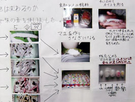 「味の素のまゆが一番大きくなったときは、やっぱり人工えさはまずくて味の素を混ぜると少しはおいしくなるんだと思った。」という研究結果です。真綿作り